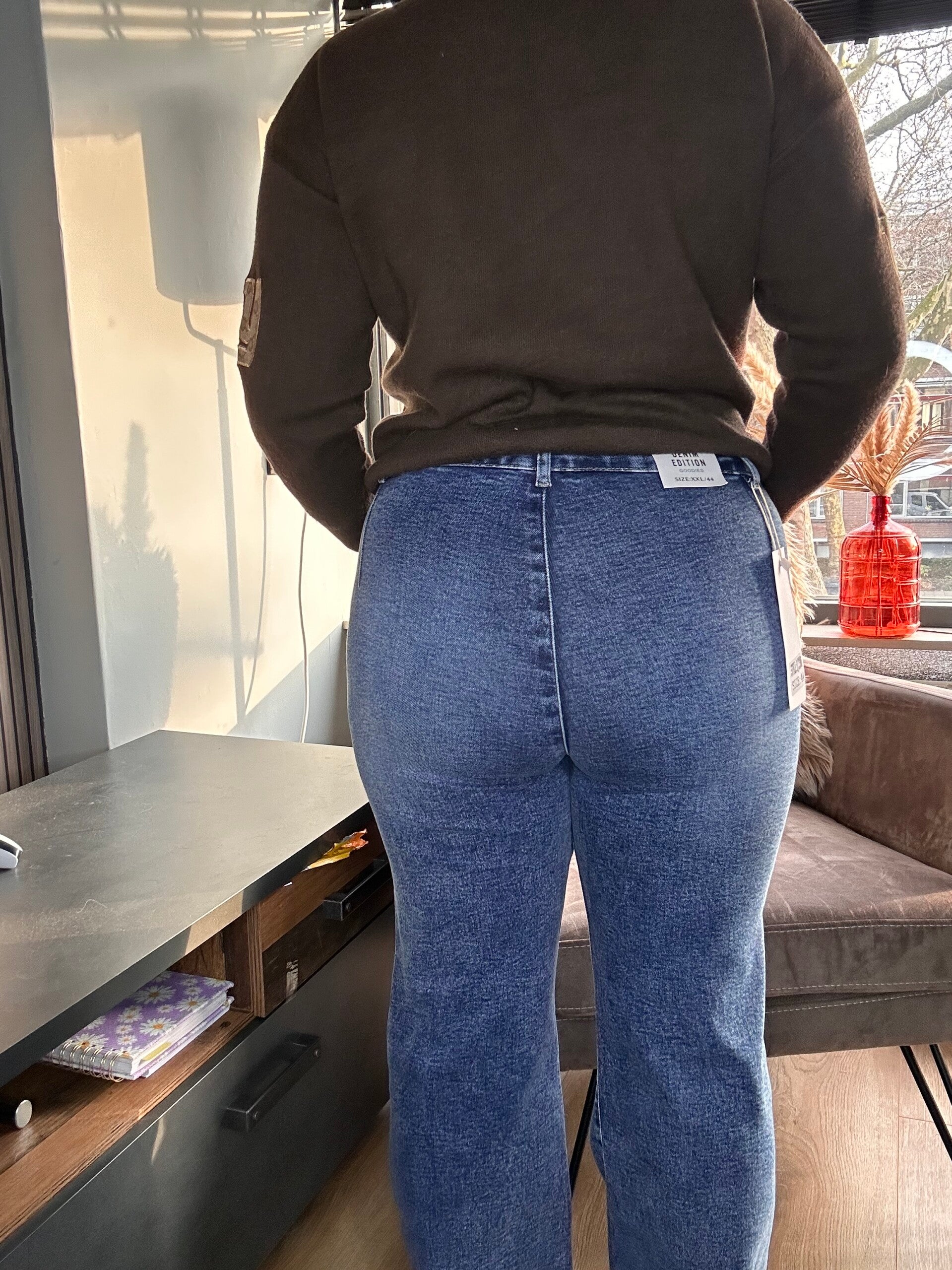 Jeans heeft stretch en geen kontzakken. Model op de foto heeft maat 44 en is 1,65