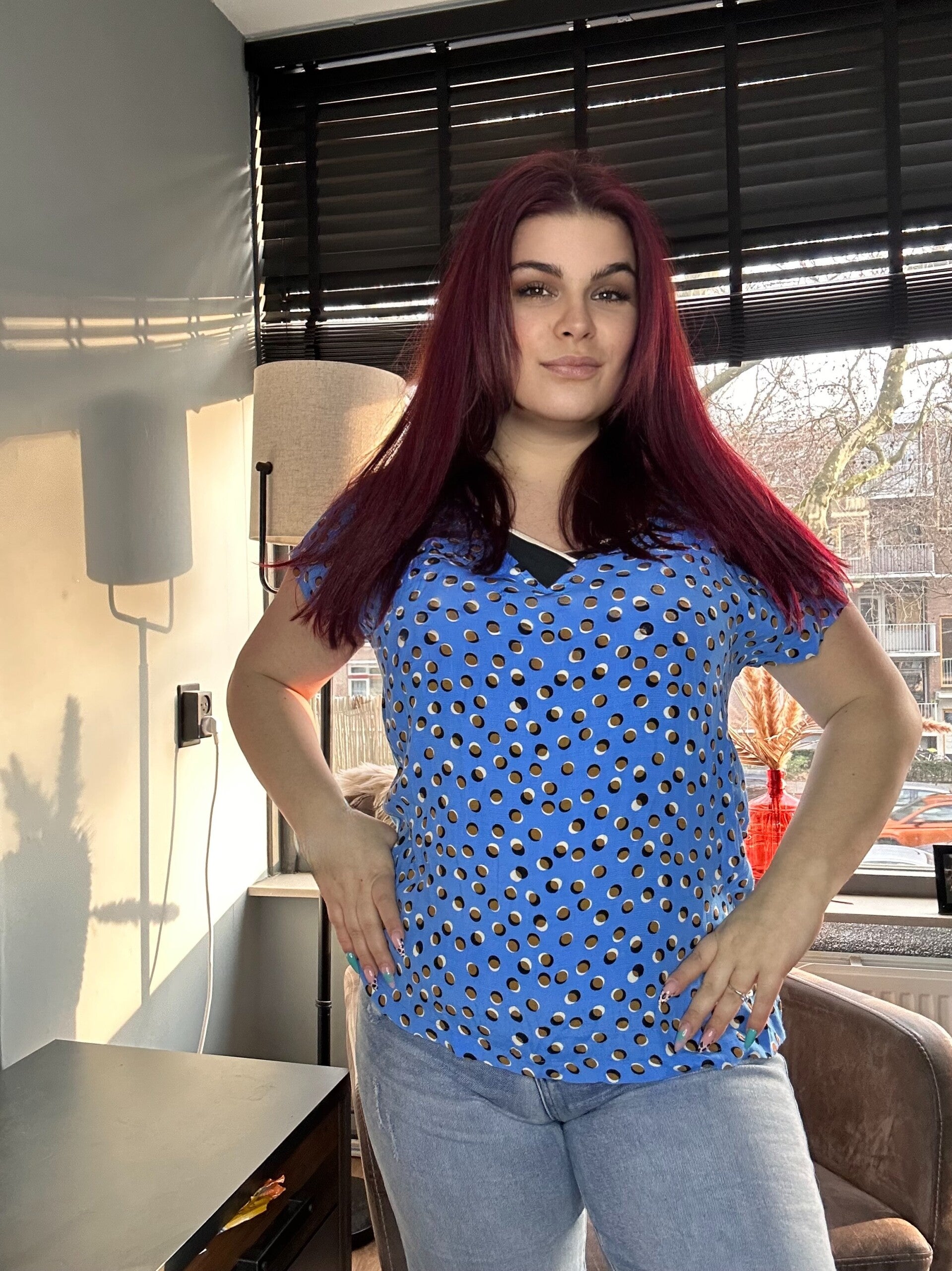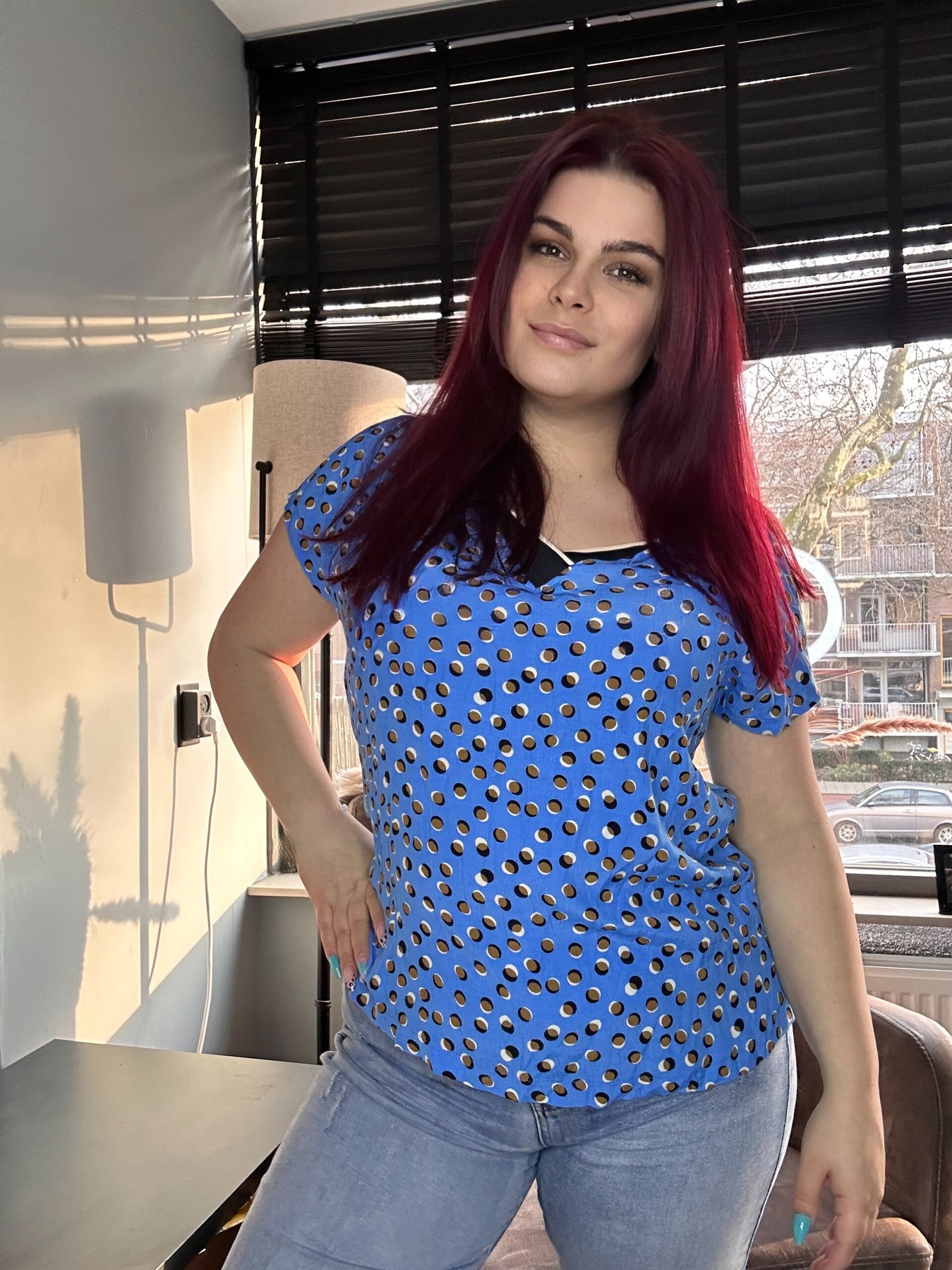 Blouse maat L. Model heeft zelf een m/L en is 1,65 lang